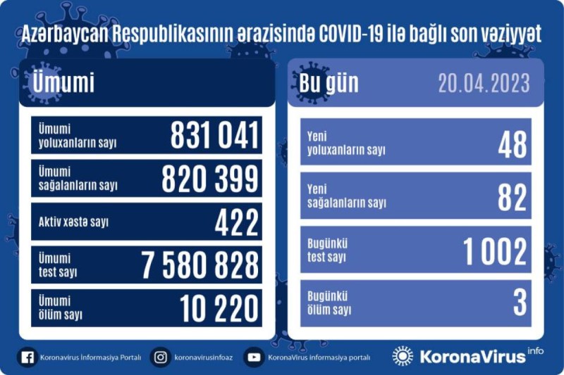 Azərbaycan Respublikasında koronavirus (COVID-19) infeksiyasına 48 yeni yoluxma faktı qeydə alınıb, 82 nəfər müalicə olunaraq sağalıb.