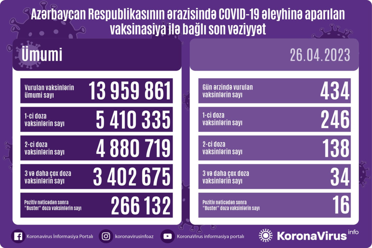 Azərbaycanda son sutkada koronavirus (COVID-19) əleyhinə 434 vaksin vurulub. Bir gündə birinci mərhələ üzrə vaksinasiya olunanların sayı 246, ikinci mərhələ üzrə vaksinasiya olunanların sayı 138, üç və daha çox doza üzrə vaksinasiya olunanların sayı 34, pozitiv nəticədən sonra buster doza üzrə vaksinasiya olunanların sayı 16 nəfərdir.