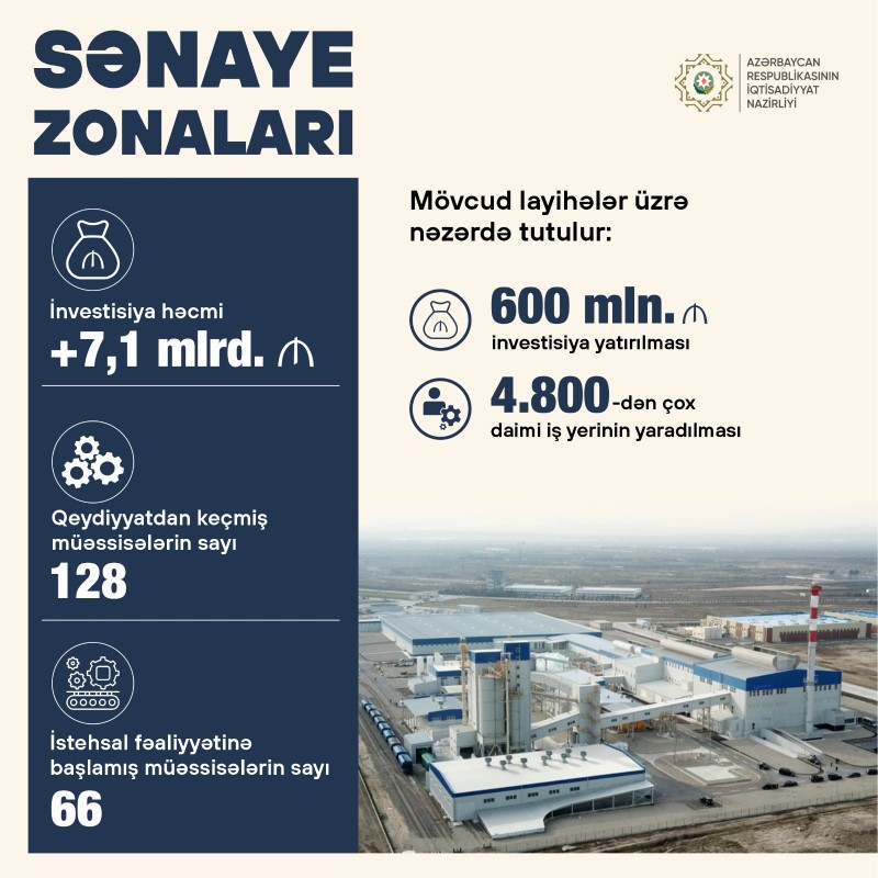 Sənaye zonalarında ümumi investisiya həcmi 7,1 milyard manatdan çox olan 128 müəssisə qeydiyyatdan keçib və onlardan 66-sı istehsal fəaliyyətinə başlayıb.