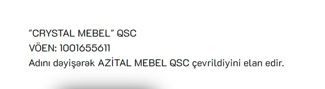 Azərbaycanın mebel istehsalçısı "Crystal Mebel" QSC adını dəyişib.