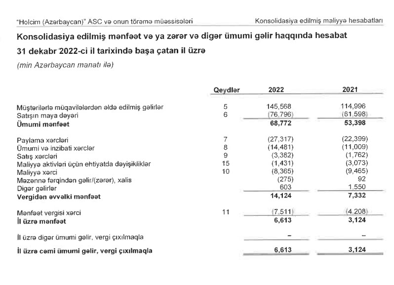 2022-ci ildə "Holcim Azərbaycan" ASC-nin əməliyyat mənfəəti 1,9 dəfə artaraq 14 milyon 124 min manat təşkil edib. Şirkət əməliyyat mənfəətindən 7 milyon 511 min manat mənfəət vergisi ödəyib.