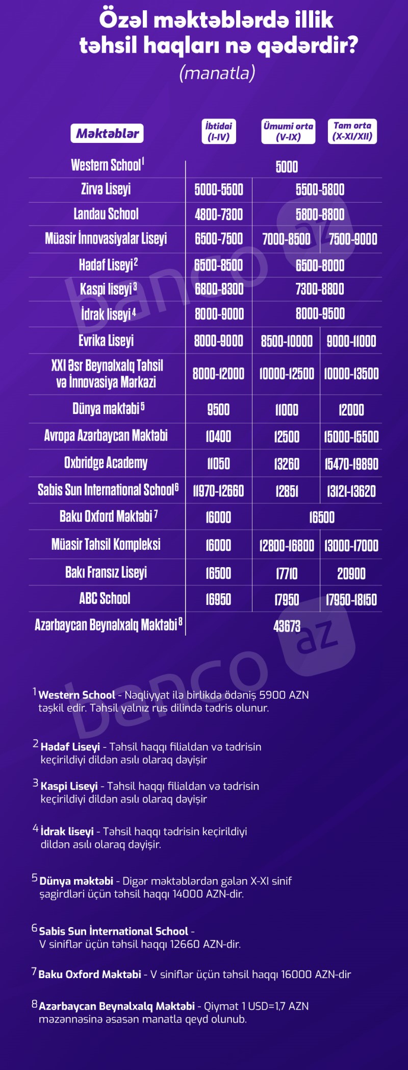Azərbaycandakı özəl məktəblərdə illik təhsil haqqı 3 000 - 44 000 manat arasında dəyişir. Qiymət təshilin ibtidai, orta və ya tam olmasından asılı olaraq fərqlənir. Bir neçə məktəbdə isə illik təhsil haqqı standartdır. Yəni, həmin məktəblərdə 1-ci sinifdən 11-ci sinifə qədər qiymət eynidir.