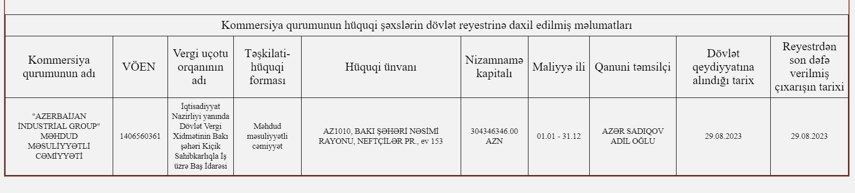 29 Avqust 2023-cü il tarixində İqtisadiyyat Nazirliyi yanında Dövlət Vergi Xidmətinin Bakı şəhəri Kiçik Sahibkarlıqla İş üzrə Baş İdarəsi "Azerbaijan İndustrial Group" MMC-ni dövlət qeydiyyatına alıb.
