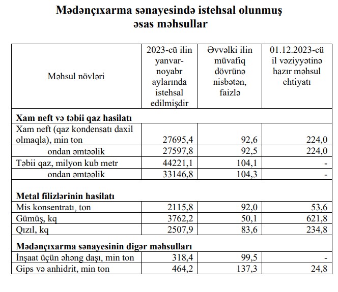 2023-cü ilin yanvar-noyabr aylarında Azərbaycanda 3 min 762,2 kq qızıl gümüş istehsal edilib. Gümüş istehsalı əvvəlki ilin müvafiq dövrünə nisbətən 49,9% azalıb.