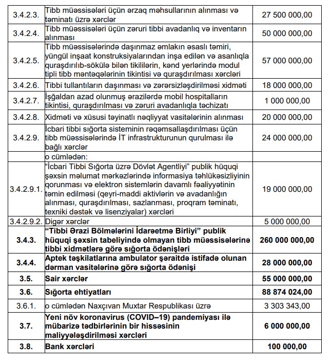 Fondun xərclərinin isə 2 503 074 032 manatını icbari tibbi sığorta ödənişləri və dotasiya təşkil edəcək.
