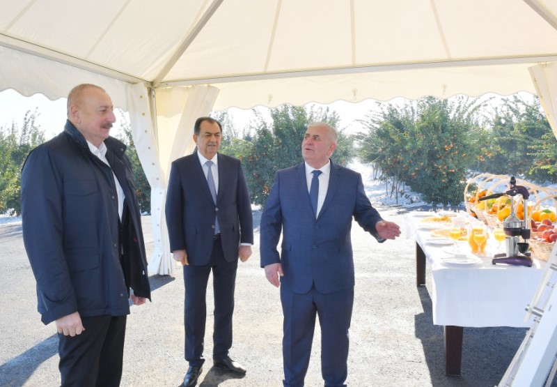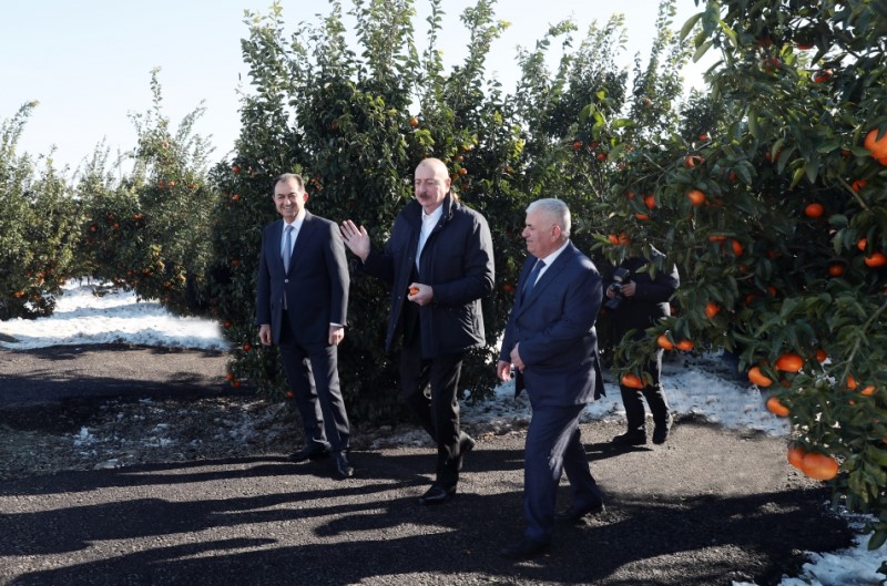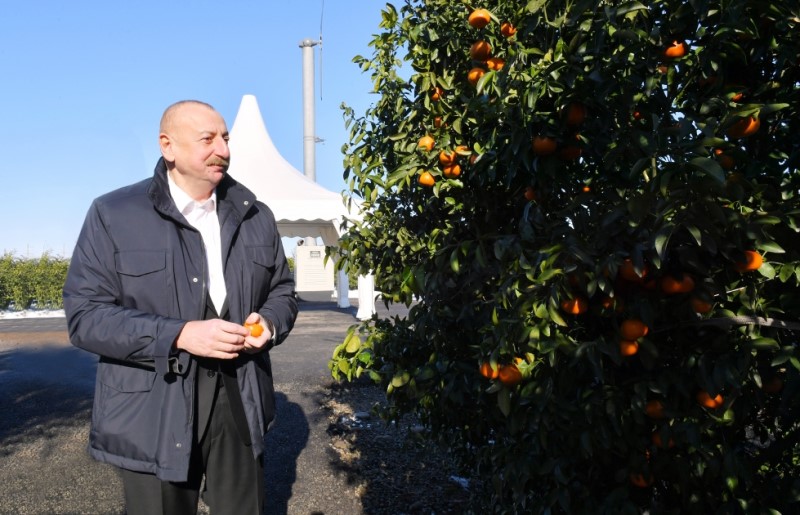Dövlətimizin başçısı “Lenk Fruit” Məhdud Məsuliyyətli Cəmiyyətinin (MMC) Lənkəran rayonunun Separadi kəndində yeni salınmış sitrus bağında yaradılan şəraitlə tanış olub.