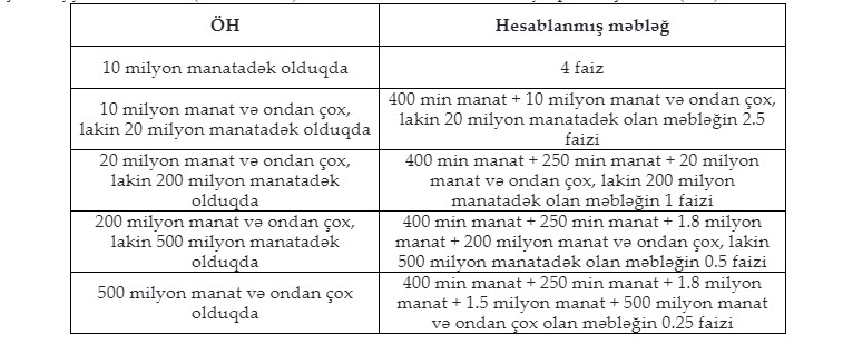 4.2.1. ödəniş təşkilatının son 12 (on iki) ay ərzində icra olunmuş ödəniş əməliyyatlarının 1/12 (on ikidə bir) hissəsinə bərabər olan orta aylıq ödəniş həcmi (ÖH) hesablanır və ÖH-yə aşağıdakı cədvələ uyğun əmsallar tətbiq edilir: