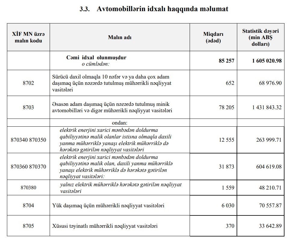 2025-ci ilin 9 ayı ərzində (yanvar-sentyabr) Azərbaycana 1 milyard 605 milyon 21 min dollar dəyərində 85 min 257 ədəd nəqliyyat vasitəsi (avtomobil) idxal olunub.
