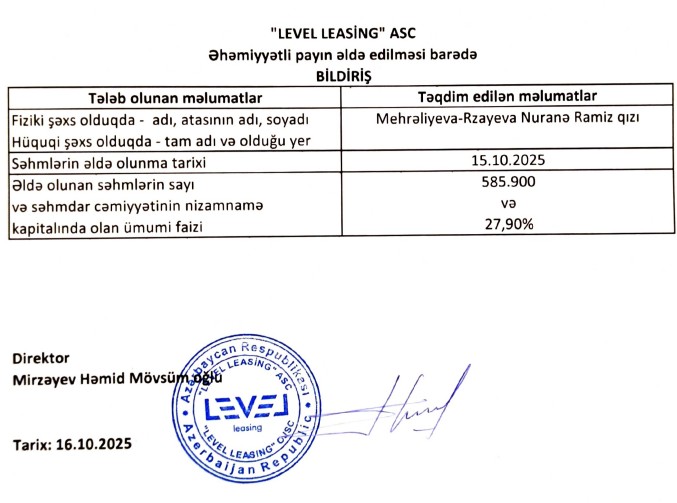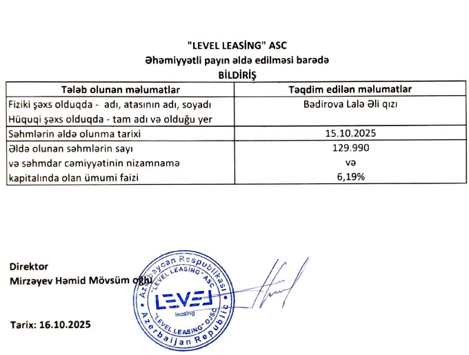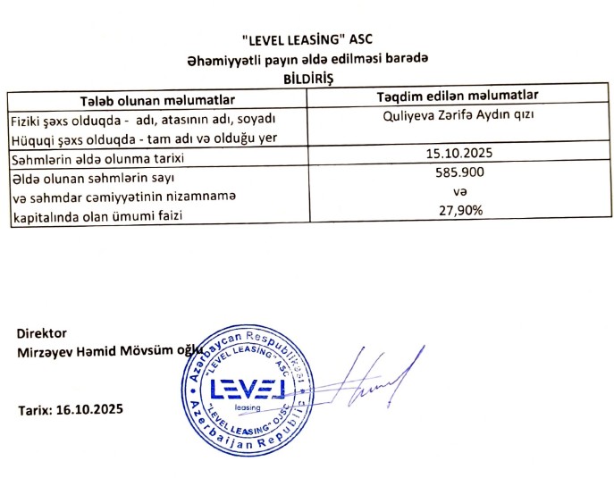 "Level Leasing"ASC əhəmiyyətli payın əldə edilməsi və özgəninkiləşdirilməsinə dair məlumatlar açıqlayıb.
