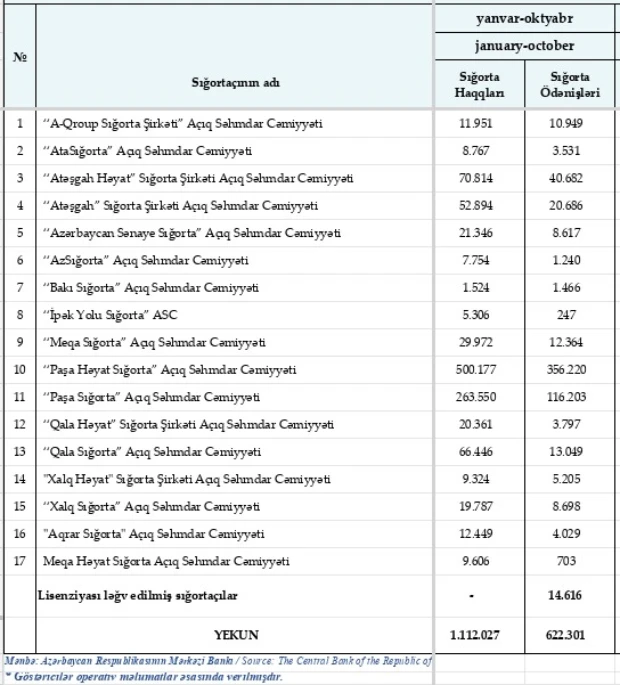 2025-ci ilin yanvar-oktyabr ayları ərzində (10 ayda) Azərbaycanda fəaliyyət göstərən sığorta şirkətləri tərəfindən hesablanmış sığorta haqları və sığorta ödənişləri (min manatla):