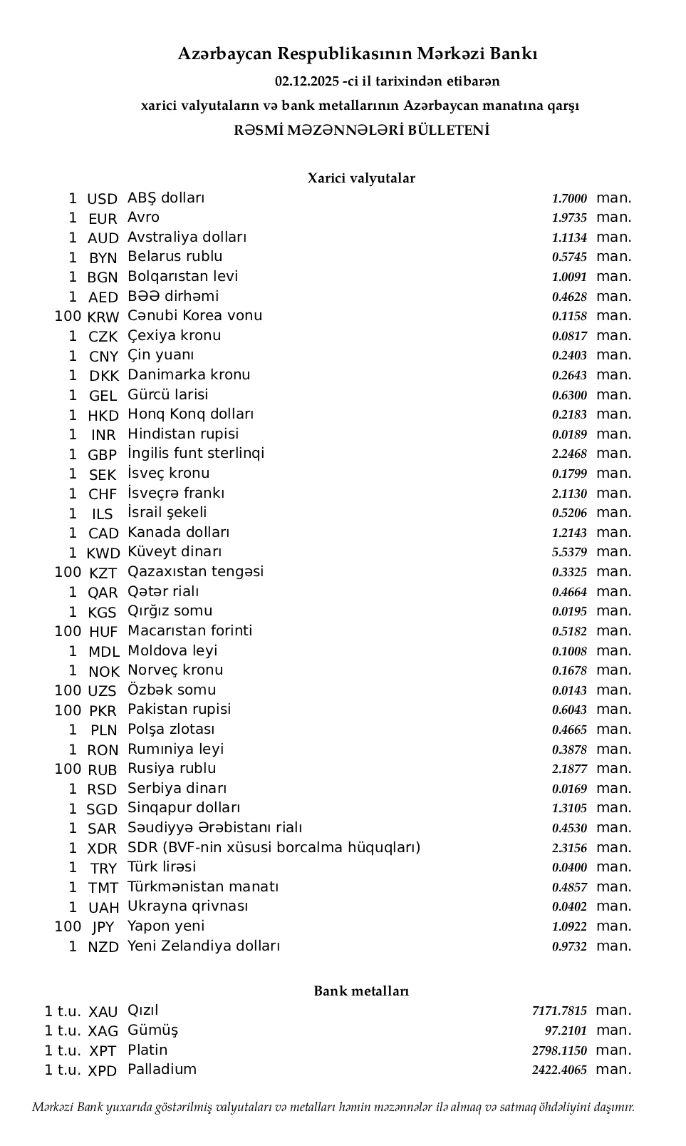 Dolların bazar ertəsi üçün rəsmi məzənnəsi müəyyən edilib