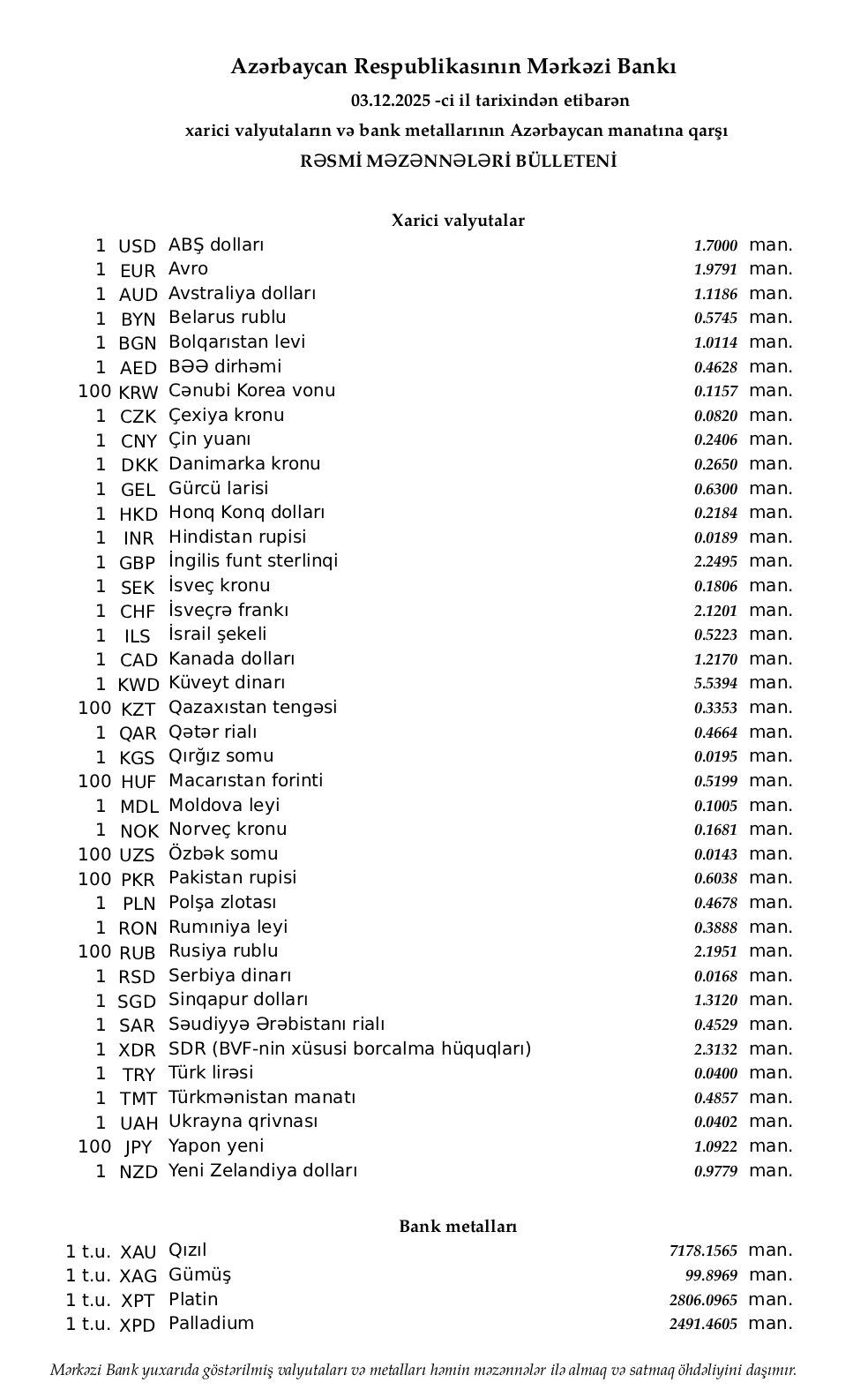 Dolların bazar ertəsi üçün rəsmi məzənnəsi müəyyən edilib
