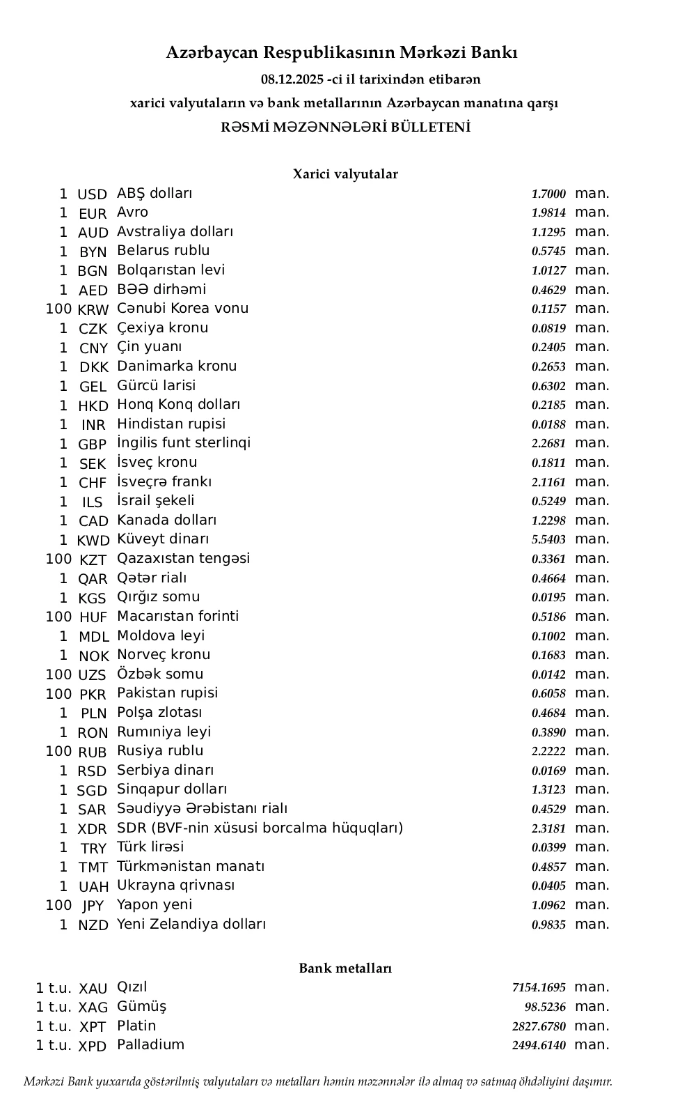 Dolların bazar ertəsi üçün rəsmi məzənnəsi müəyyən edilib