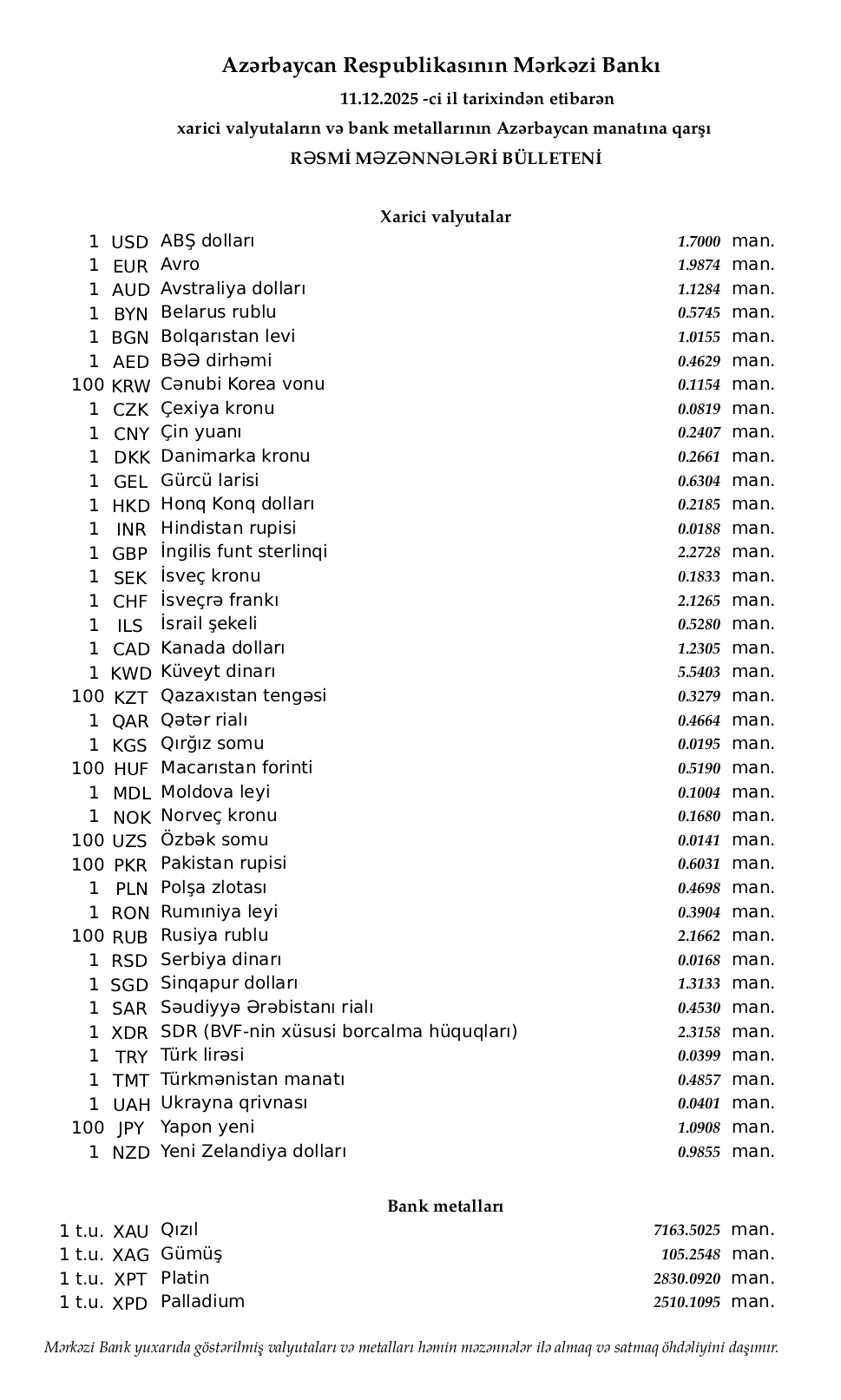 Dolların bazar ertəsi üçün rəsmi məzənnəsi müəyyən edilib