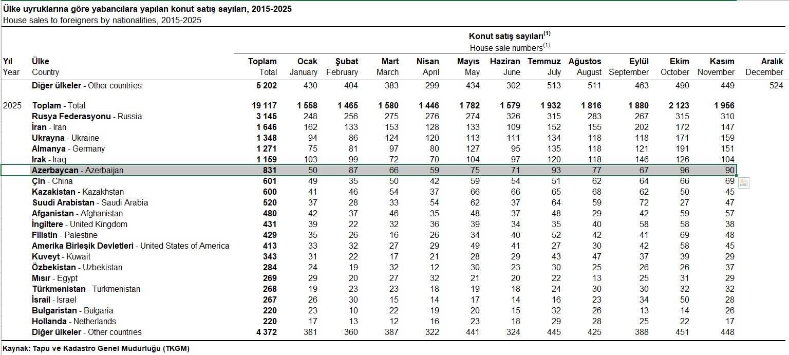 2025-ci ilin Noyabr ayında Türkiyədə Azərbaycan vətəndaşlarına 90 mənzil, yanvar–noyabr dövründə (11 ayda) isə 831 mənzil satılıb. Ötən ilin noyabr ayında Azərbaycan vətəndaşlarına 70 ədəd, 11 ay ərzində isə 756 mənzil satılmışdı.