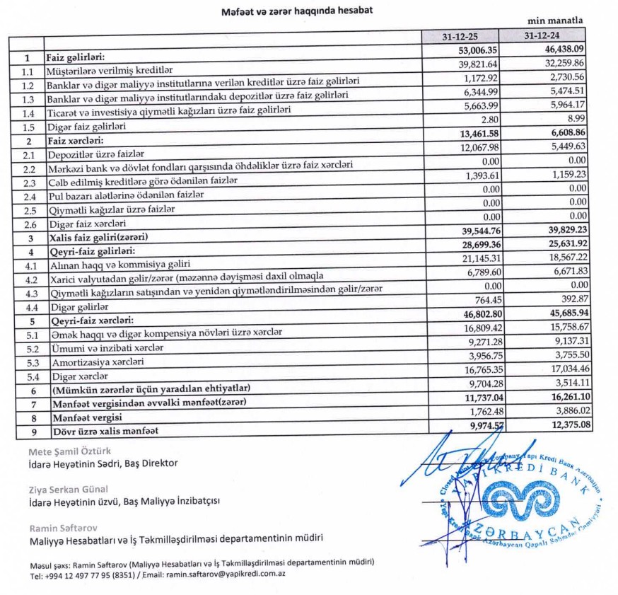 2025-ci ildə “Yapı Kredi Bank Azərbaycan”ın əməliyyat gəlirləri, aktivləri və kredit portfeli artmaqda davam edib. Lakin resursların bahalaşması, faiz xərclərinin kəskin yüksəlməsi və kredit riskləri üzrə ehtiyat ayırmalarının artması xalis mənfəətin azalmasına səbəb olub.“Yapı Kredi Bank Azərbaycan” QSC 2025-ci ili (yanvar–dekabr) gəlir və aktivlər baxımından artımla başa vurub.