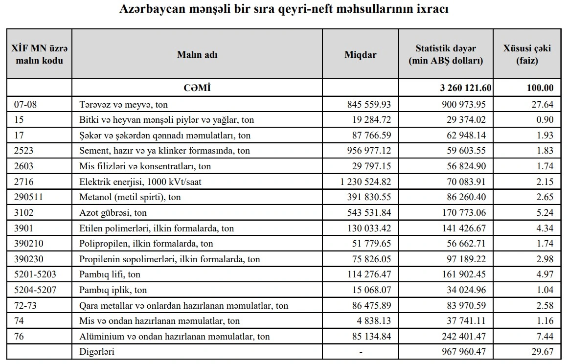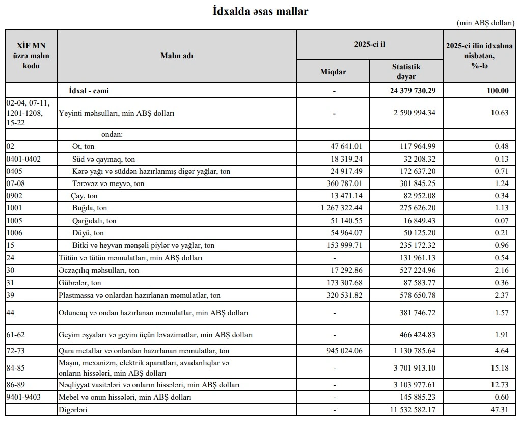 2025-cü ilin yanvar-dekabr aylarında (12 ayda) Azərbaycanın ən çox ixrac və idxal etdiyi mallar.