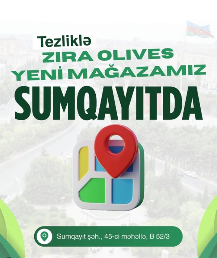 Azərbaycanın zeytun yağı və zeytun məhsulları istehsalçısı “Zirə Aqro Park” MMC şirkətinə məxsus “Zira Olives” brendi ("Zira Olives" zeytun zavodu) Sumqayıt şəhərində yeni mağazasını istifadəyə verməyə hazırlaşır.