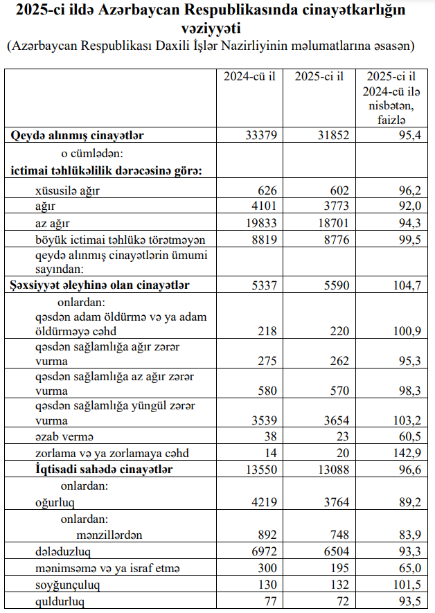 Azərbaycan Respublikası Daxili İşlər Nazirliyinin məlumatlarına əsasən, 2025-ci il ərzində ölkədə 31 min 852 cinayət hadisəsi qeydə alınmışdır ki, bu da 2024-cü ilin göstəricisindən 4,6 faiz azdır.