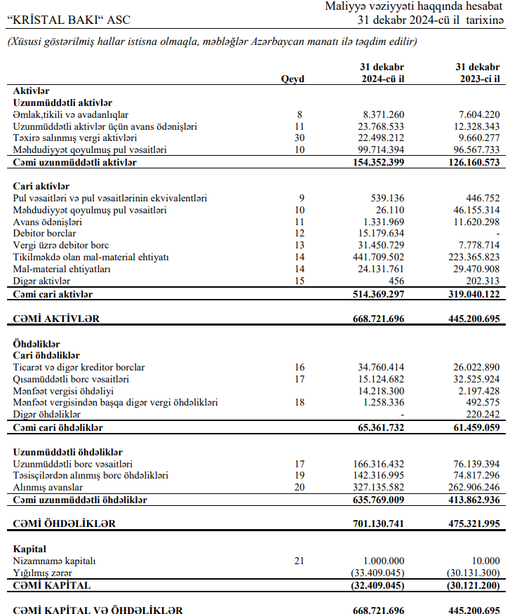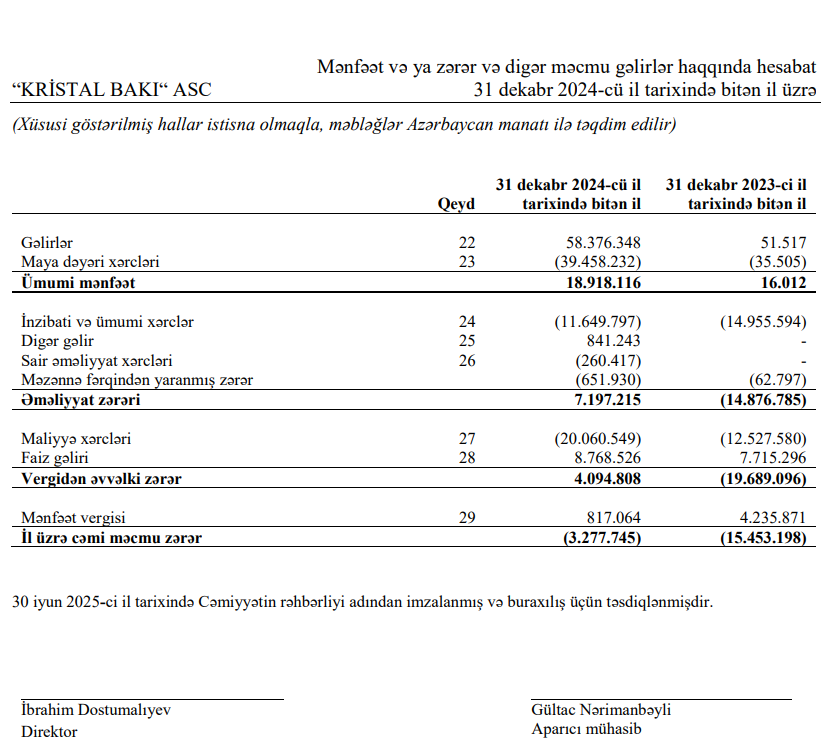 Kristal Bakı ASC Kristal Bakı maliyyə hesabatı Kristal Bakı xalis zərər Kristal Bakı gəlir artımı tikinti şirkəti maliyyə nəticələri Azərbaycan tikinti sektoru 2024 maliyyə göstəriciləri 2023 maliyyə müqayisəsi əməliyyat gəlirlərinin artımı tikinti layihələri gəlirliliyi Bakıda yaşayış kompleksləri Nərimanov metro stansiyası yaxınlığı layihə Bakı