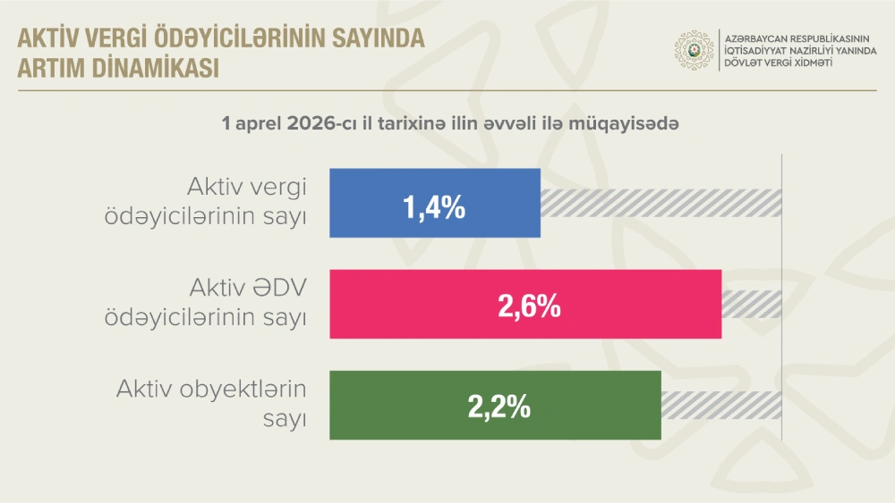 1 aprel 2026-cı il tarixinə aktiv vergi ödəyicilərinin sayı ilin əvvəli ilə müqayisədə 1,4 faiz artaraq 871 min 138 təşkil edib.
