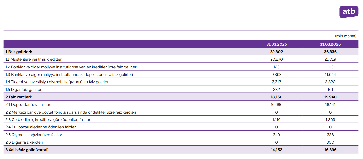 Faiz gəlirləri 12,5% artaraq 36,3 milyon manata, qeyri-faiz gəlirləri isə 20,6% yüksələrək 10,2 milyon manata çatıb.