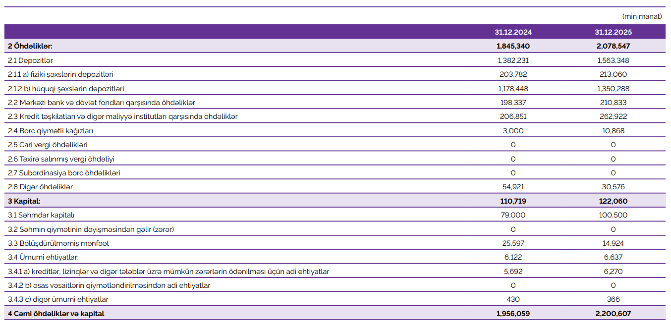 Hesabat dövründə məcmu kapital 115,8 milyon manat təşkil edib ki, bu da illik müqayisədə 12,3 milyon manat və ya 12% artım deməkdir. Kapitalın artımı Bankın gələcək inkişafını dəstəkləyən mühüm baza kimi çıxış edir və potensial risklərə qarşı dayanıqlılığı artırır.
