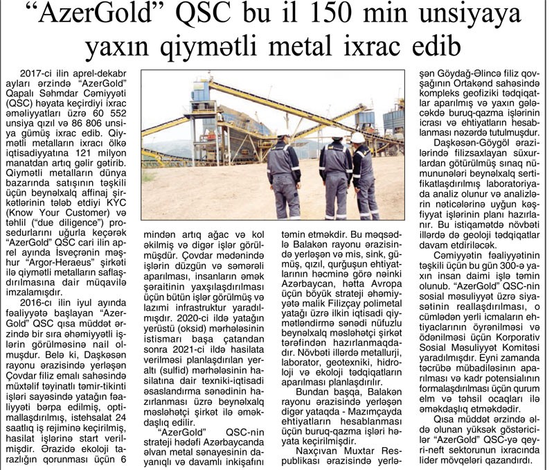 "AzərGold" QSC 2017-ci ilin 11 ayı ərzində 60552 unsiya qızıl, 86806 unsiya gümüş ixrac edib.