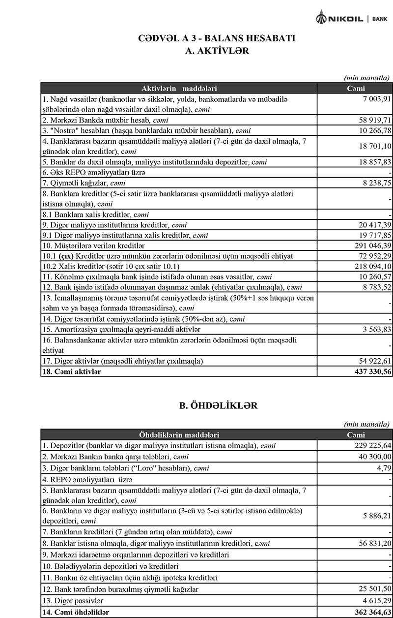 Qeyd edək ki, 2016-cı ildə “Nikoil Bank”ın faiz gəlirləri 87 milyon 222 min manat, qeyri-faiz gəlirləri 20 milyon 946 min manat (cəmi 108 milyon 168 min manat), xərclər çıxıldıqdan sonra əməliyyat mənfəəti 49 milyon 979 min manat təşkil etmişdi. Bank ehtiyatlara 198 milyon 518 min manat ayırdığından 2016-cı ili 148 milyon 538 min manat zərər ilə başa vurmuşdu. Beləliklə, “Nikoil Bank”da pis gediş kəskin səngiyib, yaxşılaşma tempi davam edərsə bu il Bank mənfəətə çıxa bilər.