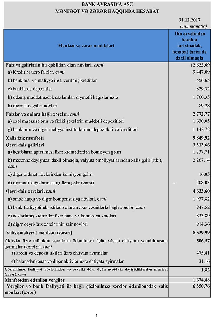 “Bank Avrasiya” ASC 2017-ci ili 6 milyon 351 min manat xalis mənfəət ilə başa vurub.