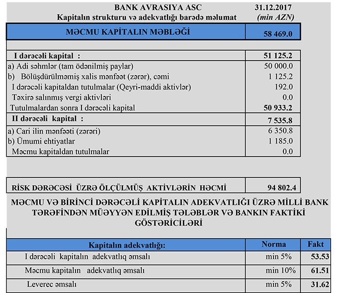 31 Dekabr 2017-ci il tarixində “Bank Avrasiya” 58 milyon 469 min manat məcmu kapitala malik olub.
