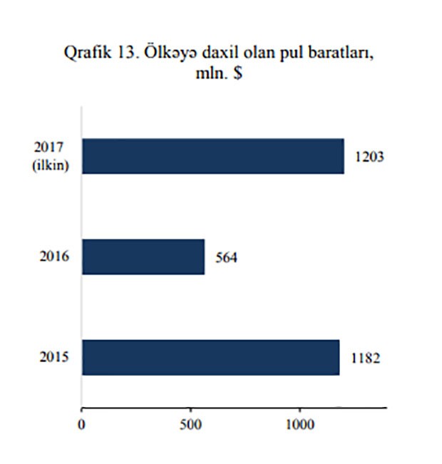 Bildirilir ki, ilkin rəqəmlərə əsasən 2017-ci ildə ölkəyə daxil olan pul baratları 1,2 mlrd. dollar təşkil edib ki, bu da 2016-cı illə müqayisədə 2,13 dəfə çoxdur. Qeyd edək ki, 2016-cı ildə ölkəyə daxil olan pul baratları 564 mln. manat təşkil edib.