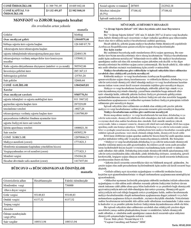 “Marja” şirkətin maliyyə hesabatlarına istinadən xəbər verir ki, “A-Qroup Sığorta Şirkəti” ASC 2017-ci ili 1 milyon 417 min manat xalis mənfəətlə başa vurub. Bu, 2016-cı illə müqayisədə 50,5% azdır. Şirkət 2017-ci ildə 2 milyon 867 min manat, 2015-ci ildə isə 7 milyon 889 min manat xalis mənfəət açıqlamışdı.