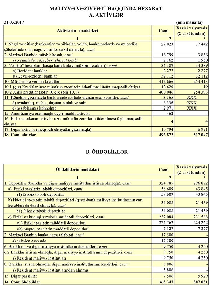 İlk rübdə, gəlirlərdən xərclər çıxıldıqdan sonra Bankın 1 milyon 610 min manat əməliyyat mənfəəti qalıb.Lakin Bankın kredit və depozit itkiləri üzrə ötən illər yaratdığı ehtiyatların 10 milyon 19 min manatı gəlirə çevrildiyindən (azad olduğundan) Bankın xalis mənfəəti 11 milyon 679 min manata yüksəlib.