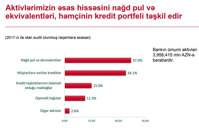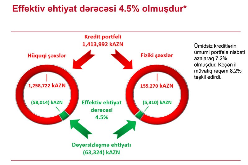 Kreditlərdə ehtimal olunan itkilərə görə 63 milyon manatlıq ehtiyat yaradılıb. Bu, 2016-cı illə müqayisədə 1 milyon manat azdır. Ötən il kreditlər üzrə ehtimal olunan pisləşmə baş verməyib.
