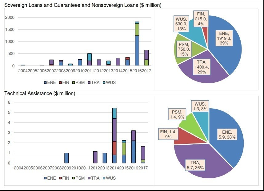 Texniki dəstək qrantlarının isə 5,9 mln. dolları və yaxud 38%-i enerji, 5,7 mln. dolları və yaxud 36%-i nəqliyyat, 1,4 mln. dolları və yaxud 9%-i maliyyə, digər 1,4 mln. dolları və yaxud 9%-i dövlət sektorunun idarə edilməsinə, 1,3 mln. dollar və yaxud 8%-i isə su və şəhər infrastrukturu, həmçinin digər xidmət sektorları üçün nəzərdə tutulub.