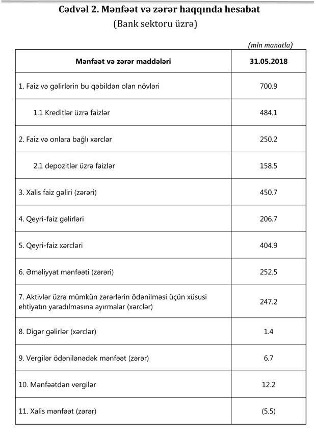 30 Aprel 2018-ci il tarixində bank sektorunun xalis zərəri 57,1 milyon manat təşkil etmişdi. May ayında xalis zərərin 51,6 milyon manat azalması bir sıra bankların xalis mənfəətlərinin artdığına işarədir.
