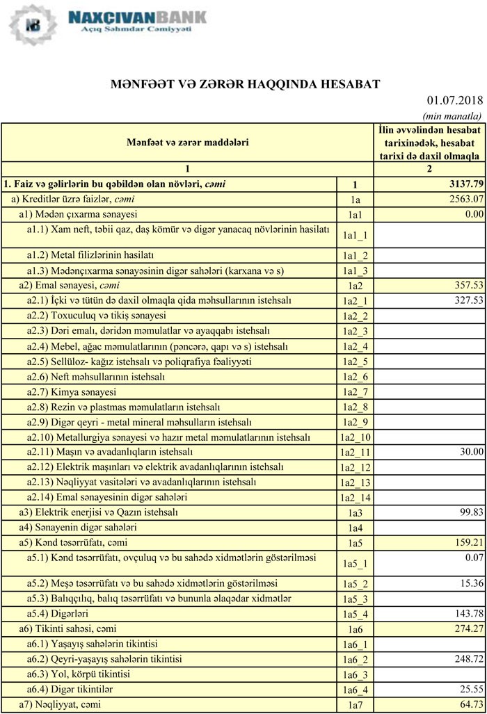 “Naxçıvanbank” ASC 2018-ci ilin birinci yarısını 2 milyon 326 min manat xalis mənfəətlə başa vurub. Bank 2018-ci ilin 1-ci rübünü 853 min manat xalis mənfəət ilə bağlamışdı.