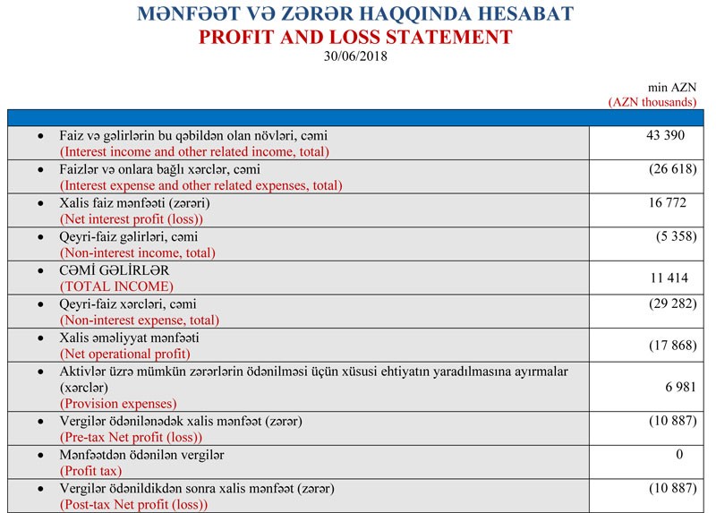 “AccessBank”ın 43 milyon 390 min manat cəmi gəlirinə qarşı cəmi xərcləri 61 milyon 258 min manat təşkil edib və nəticədə 17 milyon 868 milyon xalis əməliyyat zərəri yaranıb. Aktivlər üzrə mümkün zərərlərin ödənilməsi üçün yaradılmış ehtiyatın 6 milyon 981 min manatı azad olduğundan əməliyyat zərəri 10 milyon 887 min manata düşüb. Xalis zərər də eyni məbləğdə olub. Müqayisə üçün qeyd edək ki, Bank 2017-ci ilin birinci yarısını 42 milyon 939 min manat zərər ilə bağlamışdı. Zərərin kəskin azalması diqqəti cəlb edir. Bankın qısa zamanda mənfəətə çıxacağı gözlənilir.