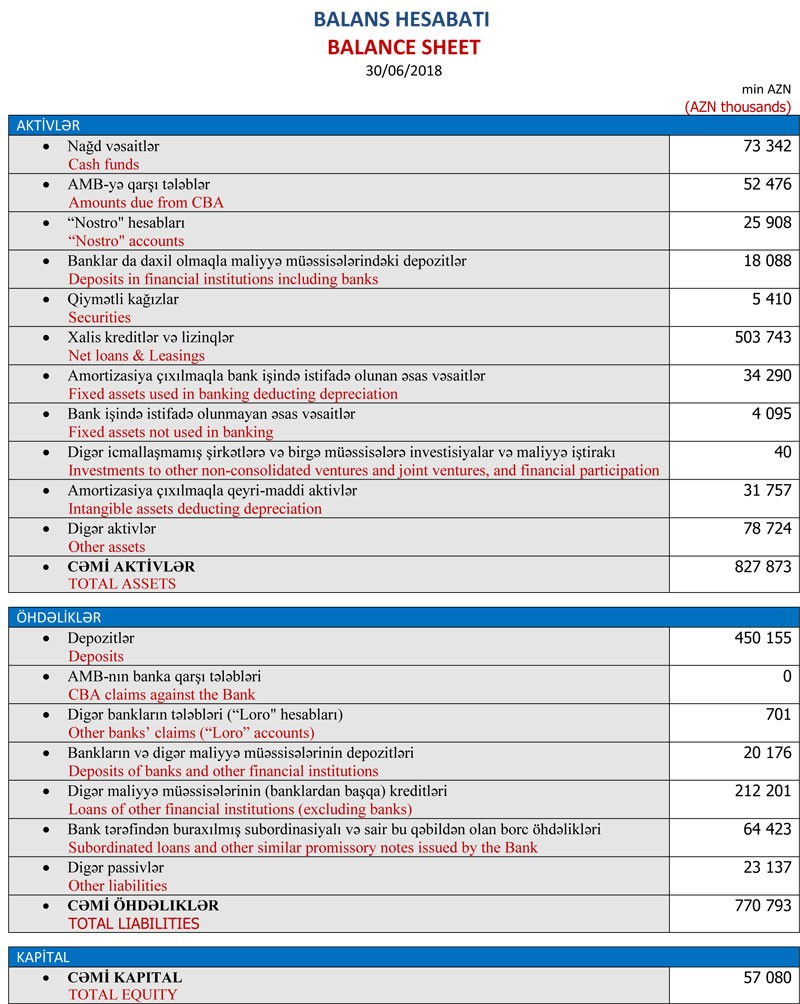 Qeyd edək ki, 31 Mart 2018-ci il tarixində "AccessBank" 824 milyon 979 min manat cəmi aktivlərə (o cümlədən 491 milyon 163 min manatı xalis kreditlər və lizinqlər), 807 milyon 266 min manat öhdəliklərə (o cümlədən 428 milyon 196 min manatı depozitlər) malik idi.