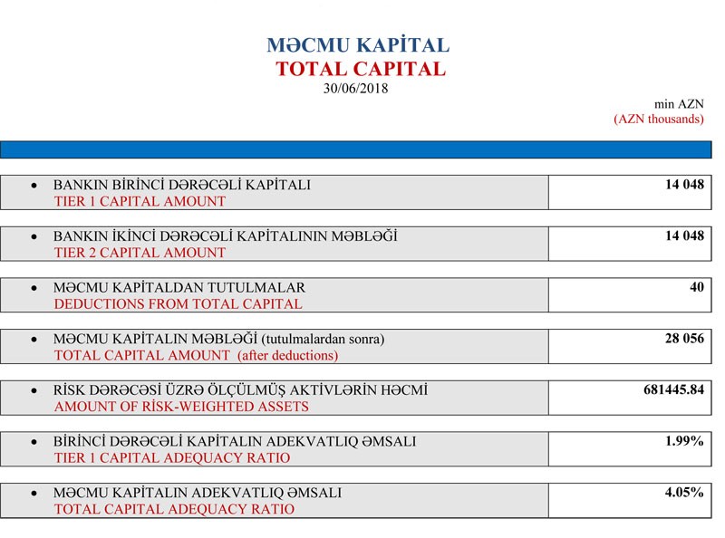 30 İyun 2018-ci ildə “AccessBank” 28 milyon 56 min manat məcmu kapitala malik olub. Bu gün “AccessBank” bəyan edib ki, nizamnamə kapitalı 2 dəfə artırılaraq 280 milyon 258 min manata qaldırılacaqdır. "AccessBank"ın İdarə Heyətinin sədri Anar Həsənov bildirib ki, ötən həftə baş tutan Səhmdarların Ümumi Yığıncağında bankın nizamnamə kapitalının 140 milyon manat məbləğində artırılması barədə qərar qəbul olunub. Kapitalın 280 milyon 258 min manata qaldırılması nəticəsində Bankın məcmu kapitalının 70 milyon manatı keçəcəyi gözlənilir.