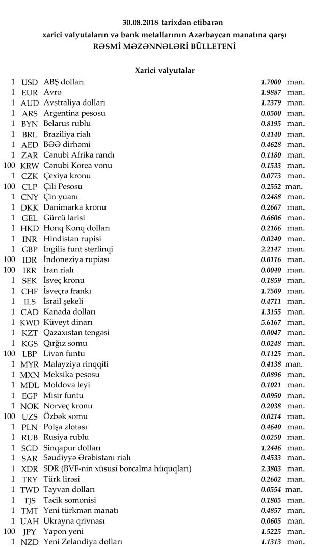 2018-ci ilin Avqust ayının 30-na Mərkəzi Bankın açıqladığı rəsmi Dollar/Manat məzənnəsi Avqust ayının 29-u ilə müqayisədə dəyişməyərək 1,7000 manat olub, Avro/manat məzənnəsi 1.9887 manata qalxıb, Rubl/manat məzənnəsi isə 0,0250 manata düşüb.
