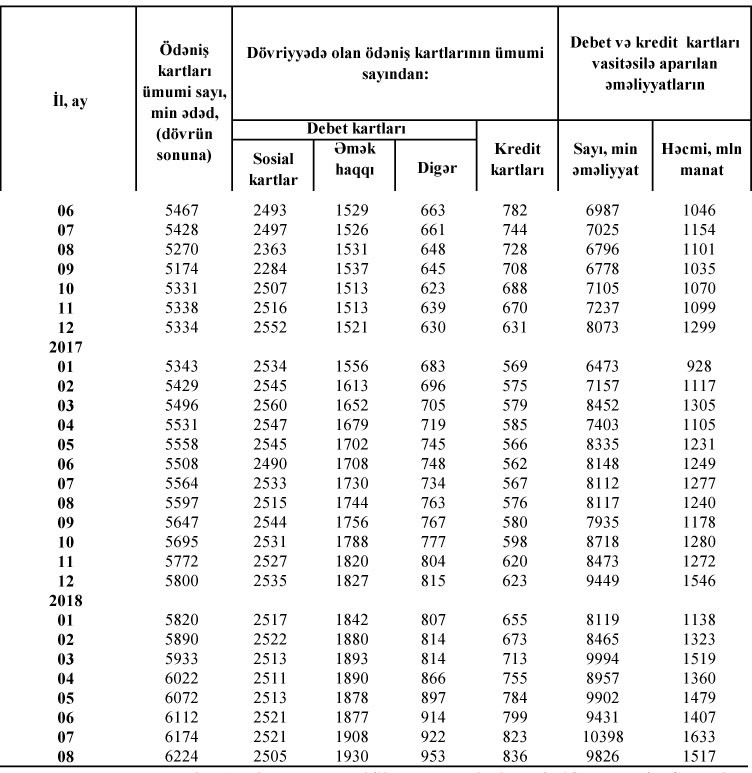 Ötən ilin sonu ilə müqayisədə isə bu ilin 8 ayı ərzində cəmi ödəniş kartlarının sayı 424 min ədəd, o cümlədən əmək haqqı kartlarının sayı 103 min ədəd, kredit kartlarının sayı 213 min ədəd, sosial kart və əməkhaqqı kartı olmayan digər debet kartlarının sayı isə 138 min ədəd artıb. Sosial kartların sayı isə 30 ədəd azalıb.