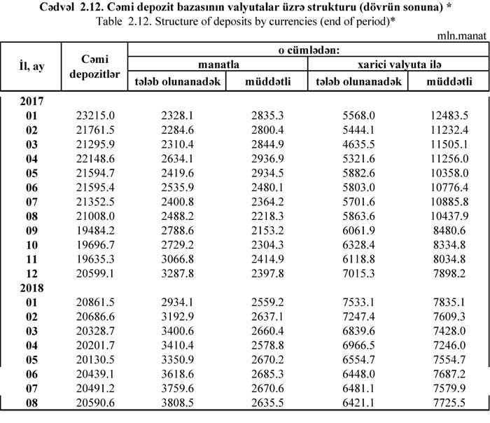 31 Avqust 2018-ci il tarixinə banklarda cəmi depozitlər (əhalinin, sahibkarların və şirkətlərin depozitləri) 20 milyard 590.6 milyon manat təşkil edib.