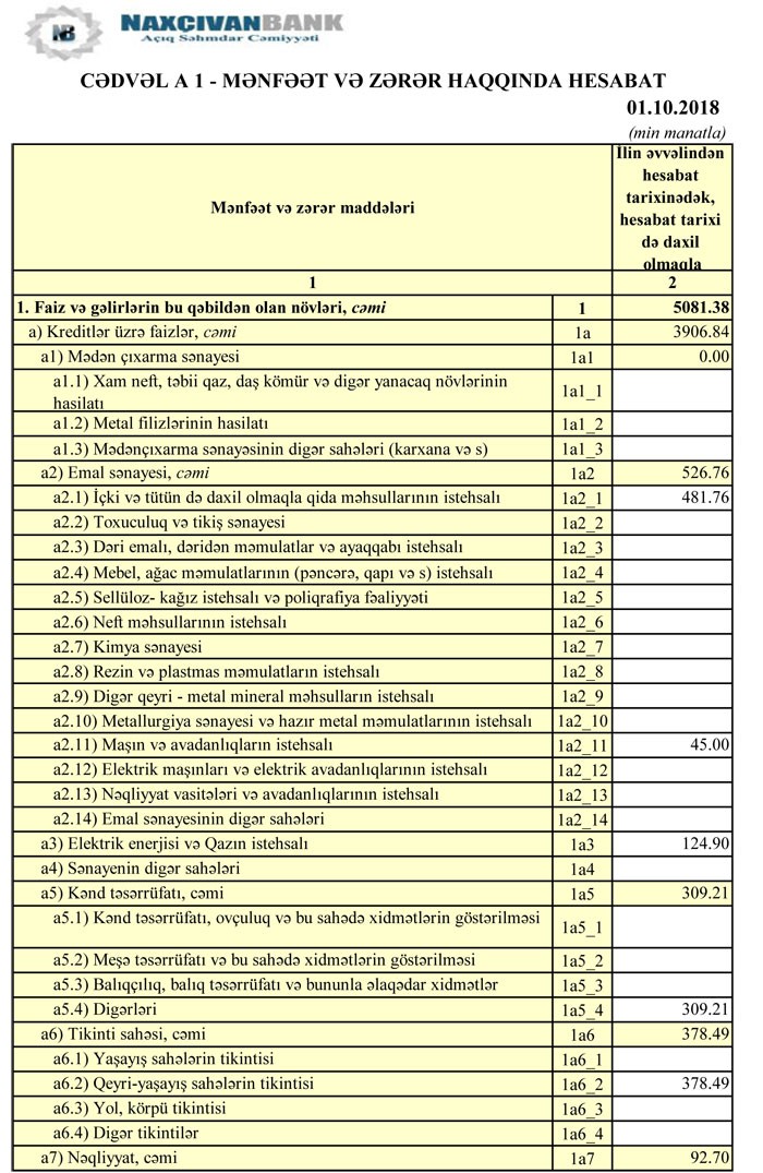 “Naxçıvanbank” ASC 2018-ci ilin 9 ayını 4 milyon 431 min manat xalis mənfəət ilə başa vurub. Müqayisə üçün qeyd edək ki, "Naxçıvanbank" ötən ilin yanvar-sentyabr aylarını 3 milyon 585 min manat xalis mənfəətlə başa vurmuşdu.