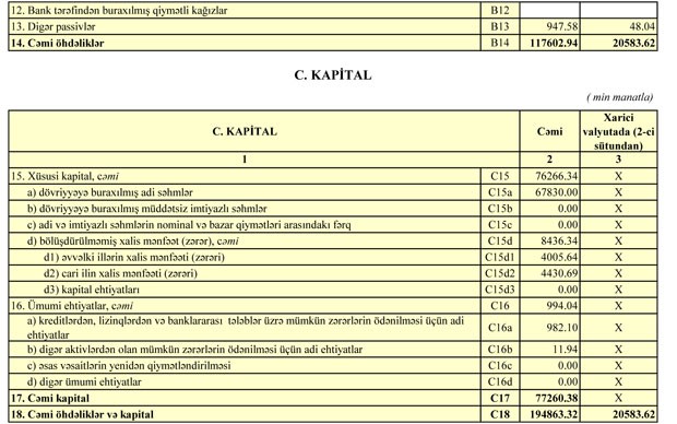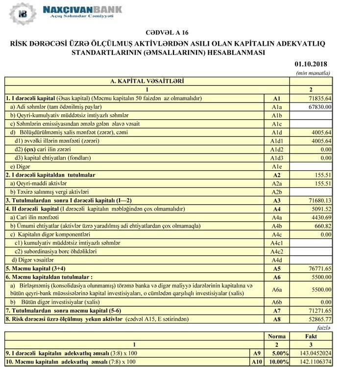 01.10.2018-ci il tarixində "Naxçıvanbank" 194 milyon 863 min manat cəmi kativlərə (o cümlədən 68391 min manatı müştərilərə verilmiş kreditlər), 117 milyon 602 min manat cəmi öhdəliklərə və 77 milyon 260 min manat cəmi balans kapitalına malik olub.