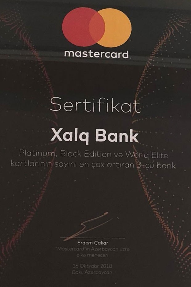 (®) Xalq Bank Master Card beynəlxalq ödəniş sisteminin premium seqment plastik kartların sayını artıran üç bankdan biridir. Bununla bağlı Bank MasterCard tərəfindən sertifikatla təltif edilib.