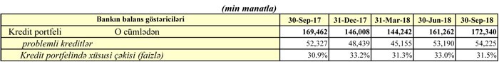 "Marja" Bankın maliyyə hesabatlına istinadən xəbər verir ki, 31 dekabr 2017-ci il tarixində problemli kreditlər 45 milyon 155 min manat ikən 30 Sentyabr 2018-ci il tarixində 54 milyon 225 min manata çatıb (9 milyon 7 min manat və ya 20% artıb).