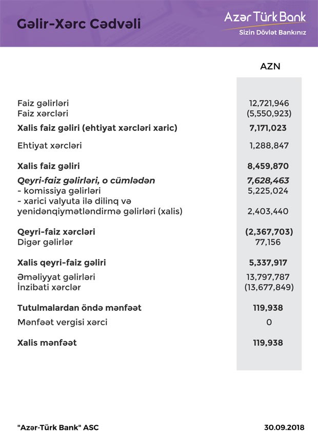Müqayisə üçün qeyd edək ki, 2017-ci ilin 9 ayında “Azər-Türk Bank”ın cəmi gəlirləri 20 milyon 201 min manat (faiz gəlirləri 12 milyon 688 min manat, qeyri-faiz gəlirləri 7 milyon 513 min manat) təşkil etmişdi.