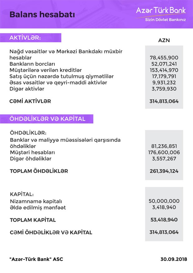 30 Sentyabr 2018-ci il tarixində “Azər-Türk Bank” 314 milyon 813 min manat cəmi aktivlərə, 261 milyon 394 min manat cəmi öhdəliklərə və 53 milyon 419 min manat cəmi balans kapitalına malik olub.